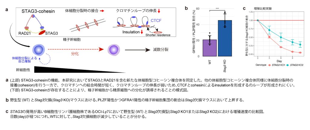 生殖細胞は遺伝情報を次世代に伝える唯一の細胞種で、それを可能とする三次元クロマチン構造をその発程過程で動的に形成します。三次元クロマチン構造は遺伝子の発現制御等に重要で、細胞種毎に異なります。これまで同研究グループは、三次元クロマチン構造の ‘区切り’ であるインシュレーション注3が、精子幹細胞において極端に弱いという現象を見出してきましたが、その形成機序や生物学的意義は不明でした。インシュレーションは体細胞分裂注1型コヒーシン複合体注4により形成されます。本研究では、クロマチン免疫沈降シーケンス法 (ChIP-seq)注5、免疫沈降質量分析解析注6などを組み合わせることで、精子幹細胞では、新たな体細胞分裂型コヒーシン複合体 STAG3-cohesin が機能することを発見し、STAG3-cohesin がインシュレーションを減弱し、精子幹細胞に特殊な三次元クロマチン構造を形成するメカニズムを解明しました。また、STAG3欠損マウスでは、精子幹細胞から精原細胞(精子形成のための減数分裂注1に入る細胞)への分化効率が低下していました。ヒトにおいては、STAG3は免疫細胞であるB細胞注7と癌種であるB細胞性リンパ腫でも高発現すること、STAG3を抑制したB細胞性リンパ腫では増殖速度が低下することも明らかにしました。本研究成果は、精子幹細胞の三次元クロマチン構造形成機序を解明し、それに基づく幹細胞機能制御の視点を提供するだけでなく、ヒト疾患におけるSTAG3の新たな役割を示唆する成果です。