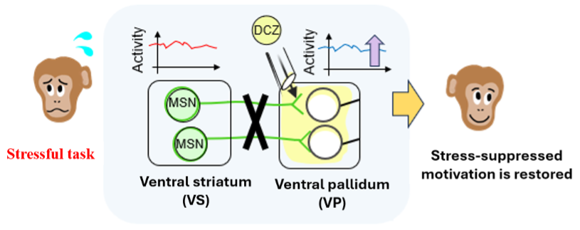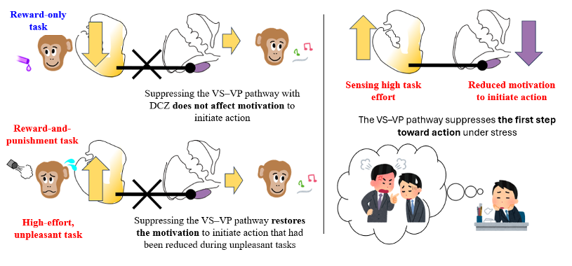 Monkeys were trained to perform two types of tasks: one that offered a reward only, and another unpleasant task that combined reward with punishment. The VS–VP pathway was temporarily suppressed using chemogenetics. In the reward-only task, motivation to initiate action was unchanged. In contrast, in the unpleasant task, motivation to start that had been reduced under stress was restored. These results show that the VS–VP pathway functions as a brake that prevents taking the first step toward action.
